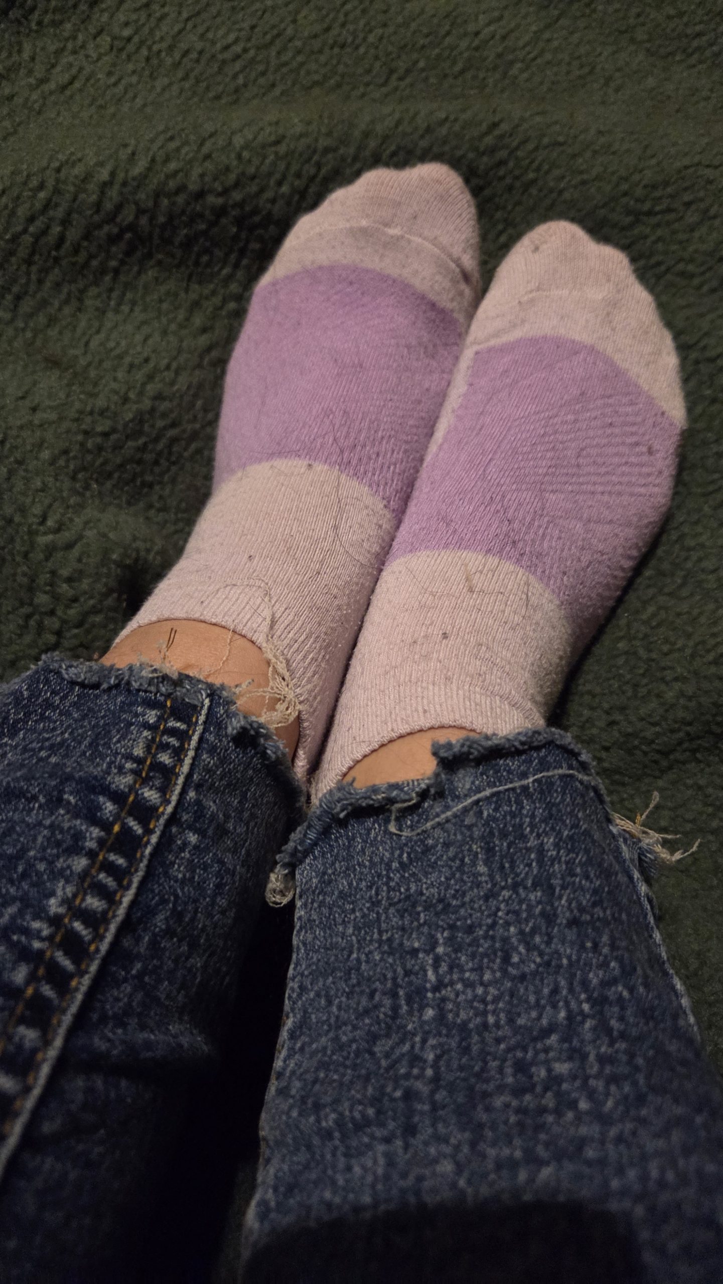 Lila, knöchelhohe Socken, die einen Tag lang während der Arbeit und dem Training getragen wurden.